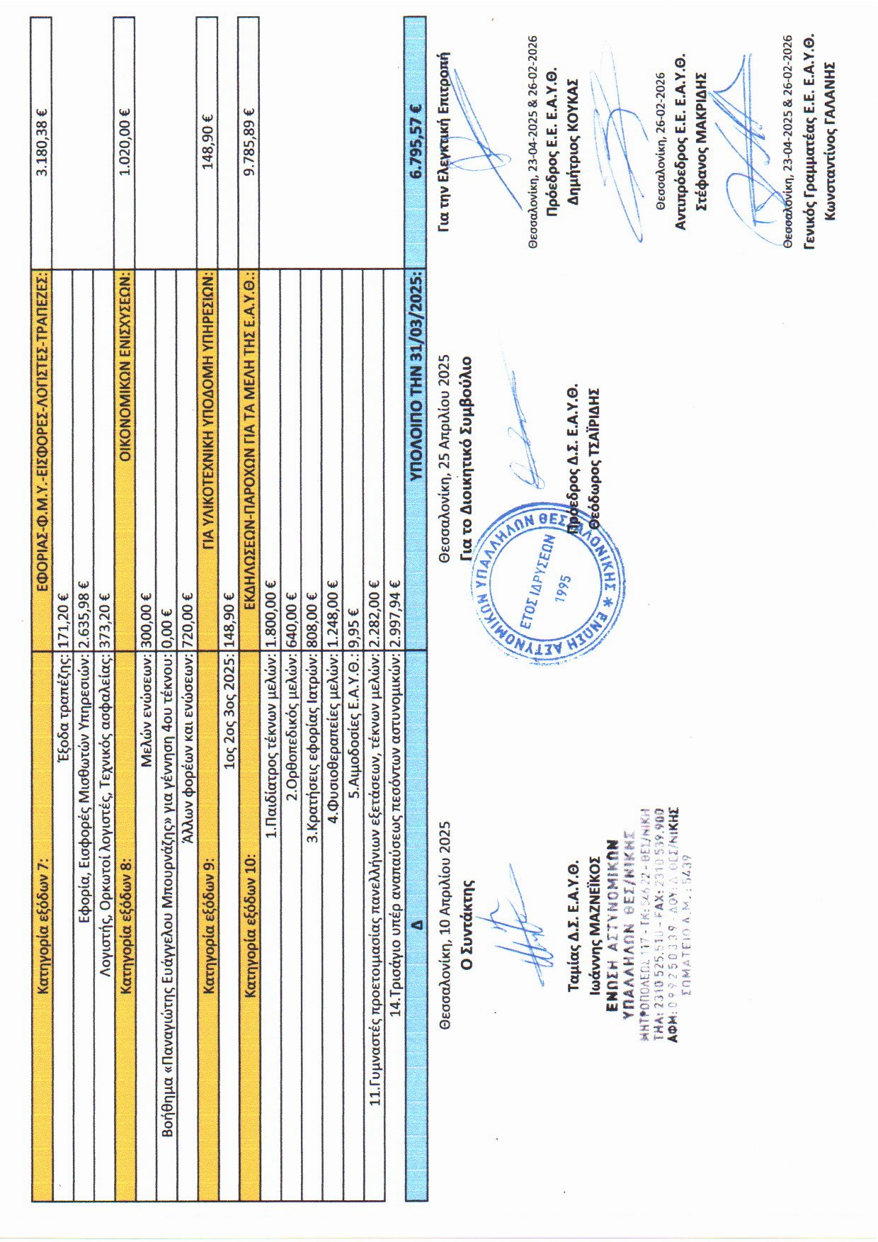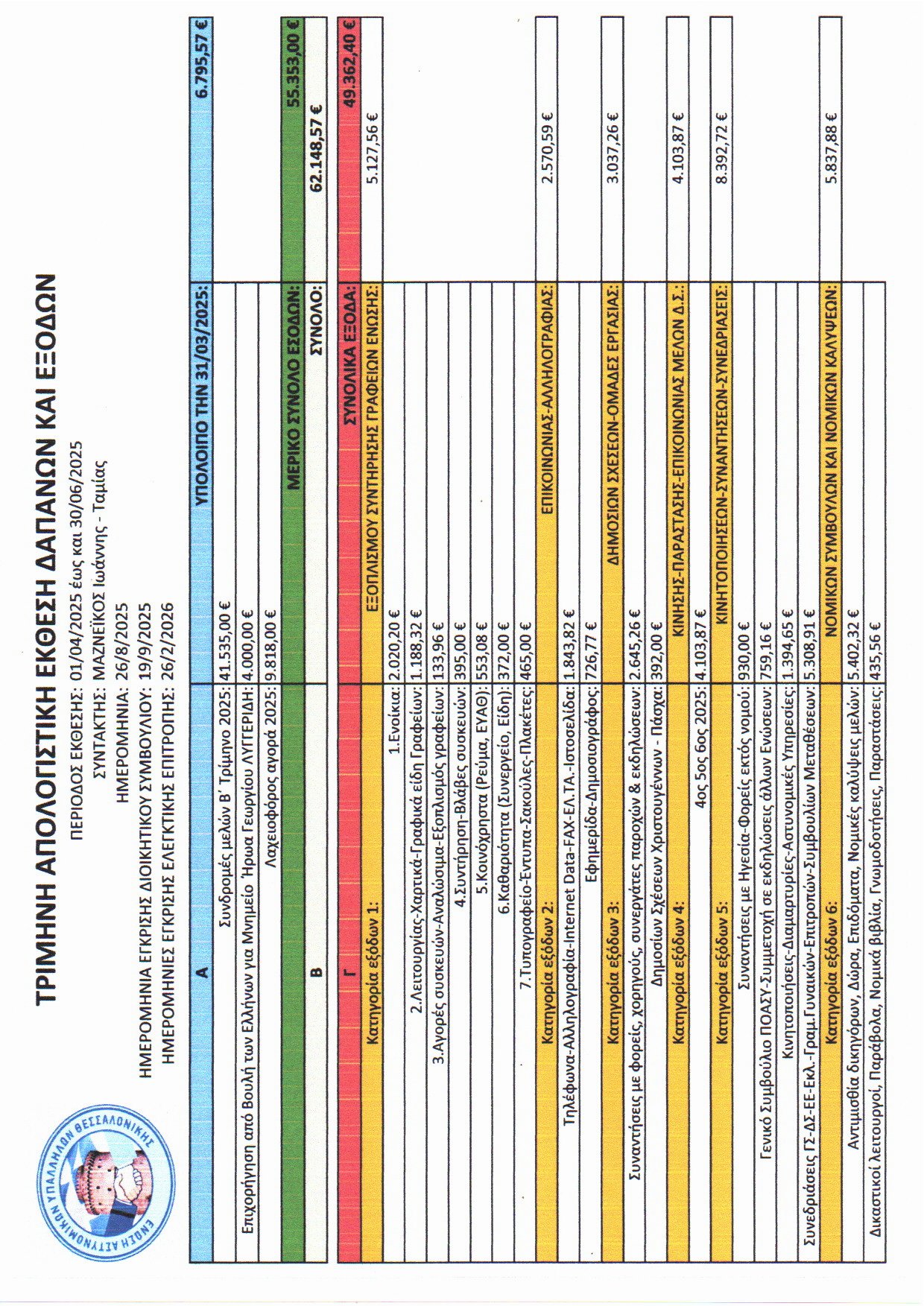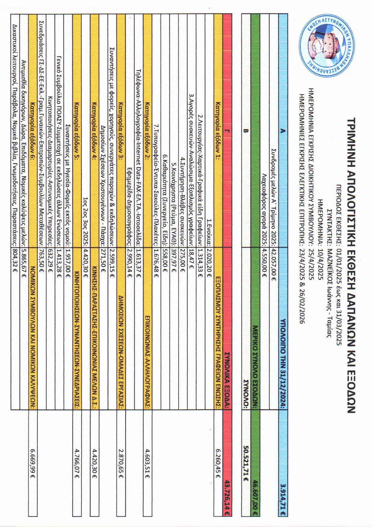 Δημοσιοποίηση των τρίμηνων απολογιστικών εκθέσεων δαπανών και εξόδων της Ένωσης από 1-1-2025 έως 31-3-2025 και από 1-4-2025 έως 30-6-2025.