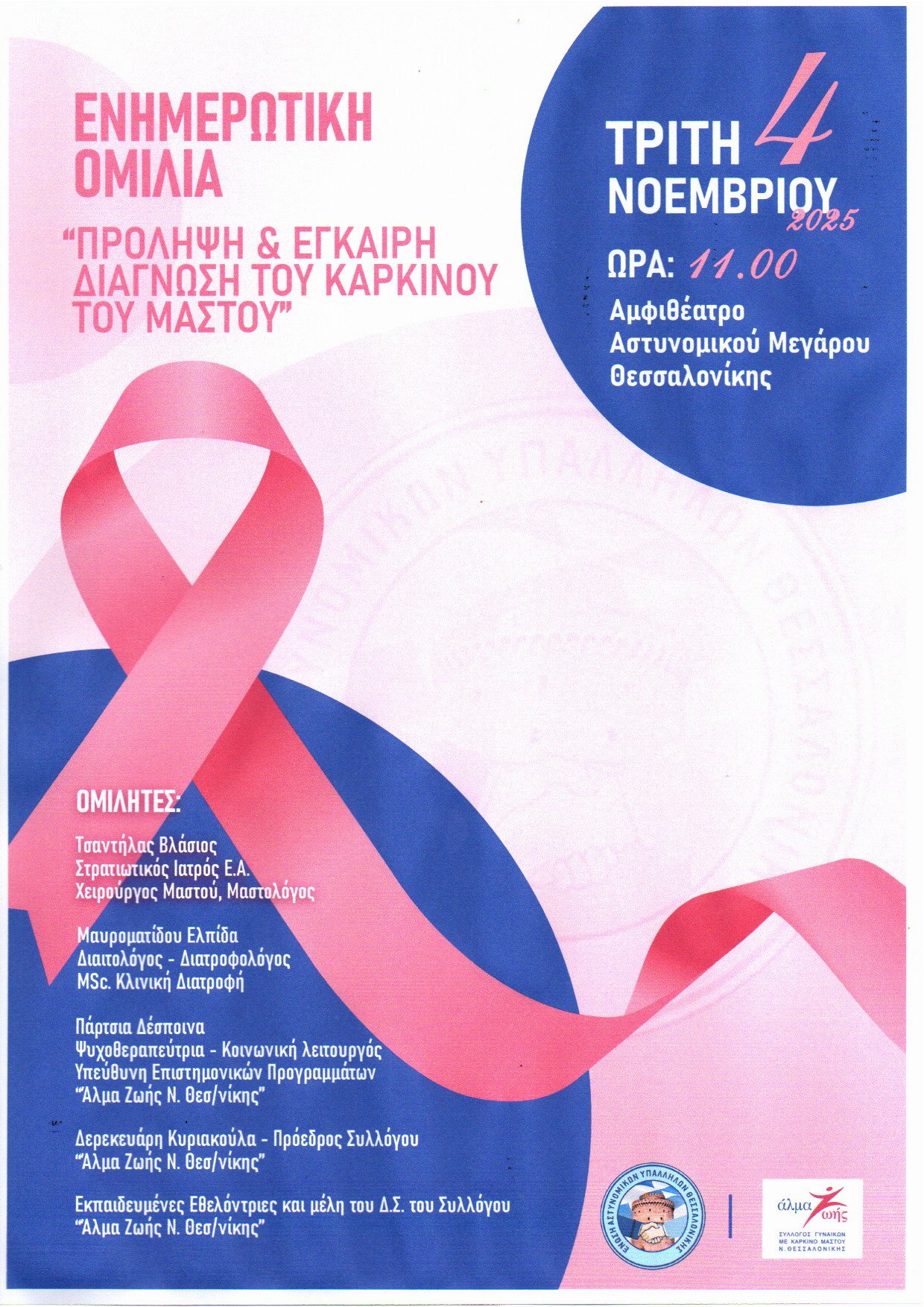 Η Ένωση Αστυνομικών Υπαλλήλων Θεσσαλονίκης, στο πλαίσιο της ενημέρωσης και ευαισθητοποίησης των μελών της σε θέματα υγείας, διοργανώνει την Τρίτη 4 Νοεμβρίου και ώρα 11:00, στο Αμφιθέατρο του Αστυνομικού Μεγάρου Θεσσαλονίκης, εκδήλωση – ομιλία με θέμα: «Πρόληψη και Έγκαιρη Διάγνωση του Καρκίνου του Μαστού»